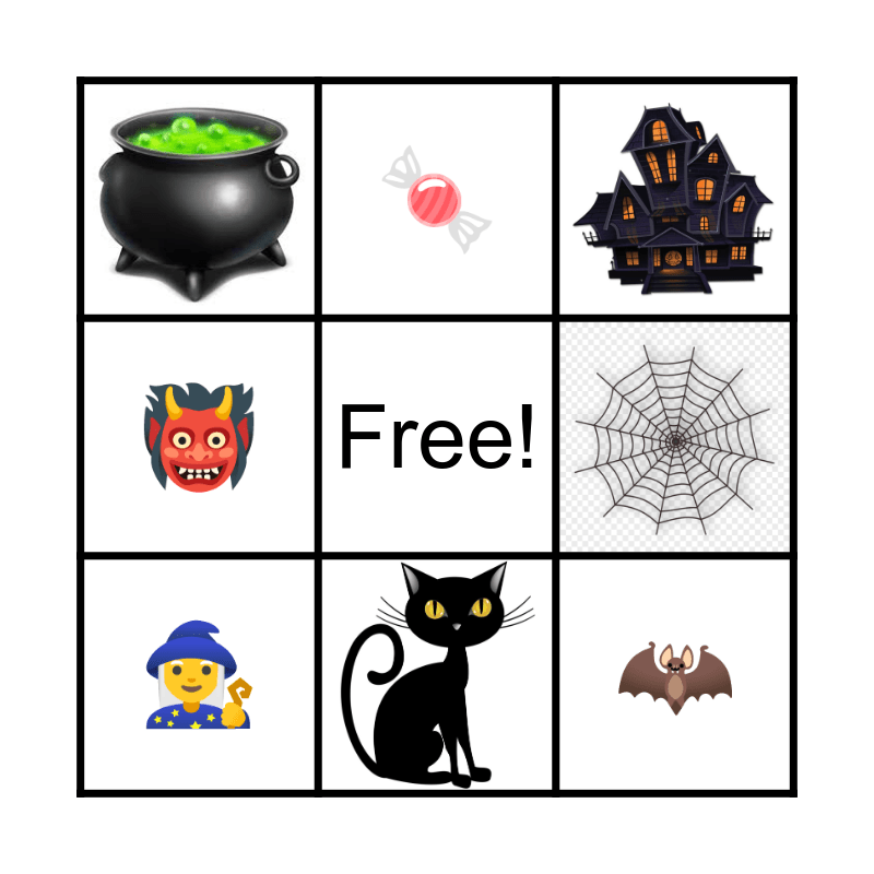 This bingo card has 6 images, a free space and 8 words: 🕷️, 🎃, 🧙♀️, 🍬, 👹, 🦇, 🧟♂️ and 👻.
