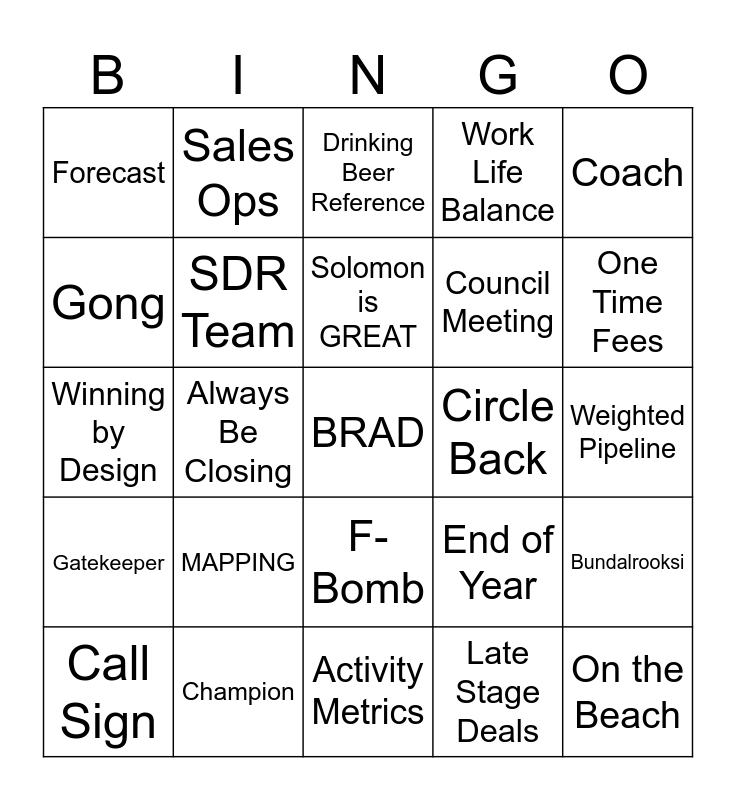 This bingo card has a free space and 24 words: MAPPING, Champion, Solomon is GREAT, Call Sign, Coach, Forecast, Gong, Sales Ops, Circle Back, F- Bomb, Council Meeting, Winning by Design, End of Year, Bundalrooksi, SDR Team, Late Stage Deals, Weighted Pipeline, Drinking Beer Reference, One Time Fees, Always Be Closing, On the Beach, Gatekeeper, Work Life Balance and Activity Metrics.