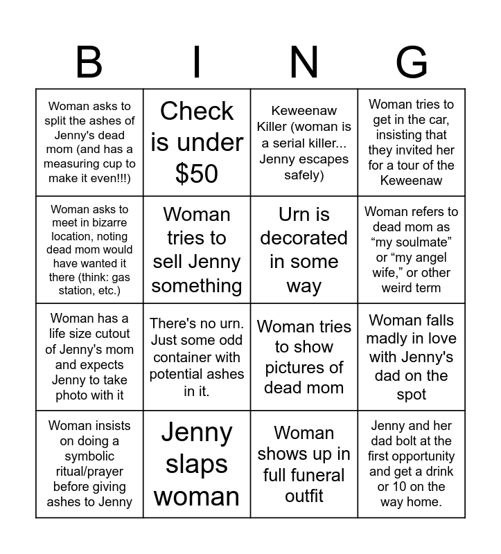 This bingo card has 16 words: Jenny slaps woman, Woman falls madly in love with Jenny's dad on the spot, Keweenaw Killer (woman is a serial killer... Jenny escapes safely), Woman asks to split the ashes of Jenny's dead mom (and has a measuring cup to make it even!!!), Woman has a life size cutout of Jenny's mom and expects Jenny to take photo with it, Check is under $50, Woman tries to show pictures of dead mom, Woman shows up in full funeral outfit, Woman asks to meet in bizarre location, noting dead mom would have wanted it there (think: gas station, etc.), Woman tries to sell Jenny something, Woman insists on doing a symbolic ritual/prayer before giving ashes to Jenny, Woman tries to get in the car, insisting that they invited her for a tour of the Keweenaw, There's no urn. Just some odd container with potential ashes in it., Woman refers to dead mom as “my soulmate” or “my angel wife,” or other weird term, Urn is decorated in some way and Jenny and her dad bolt at the first opportunity and get a drink or 10 on the way home..