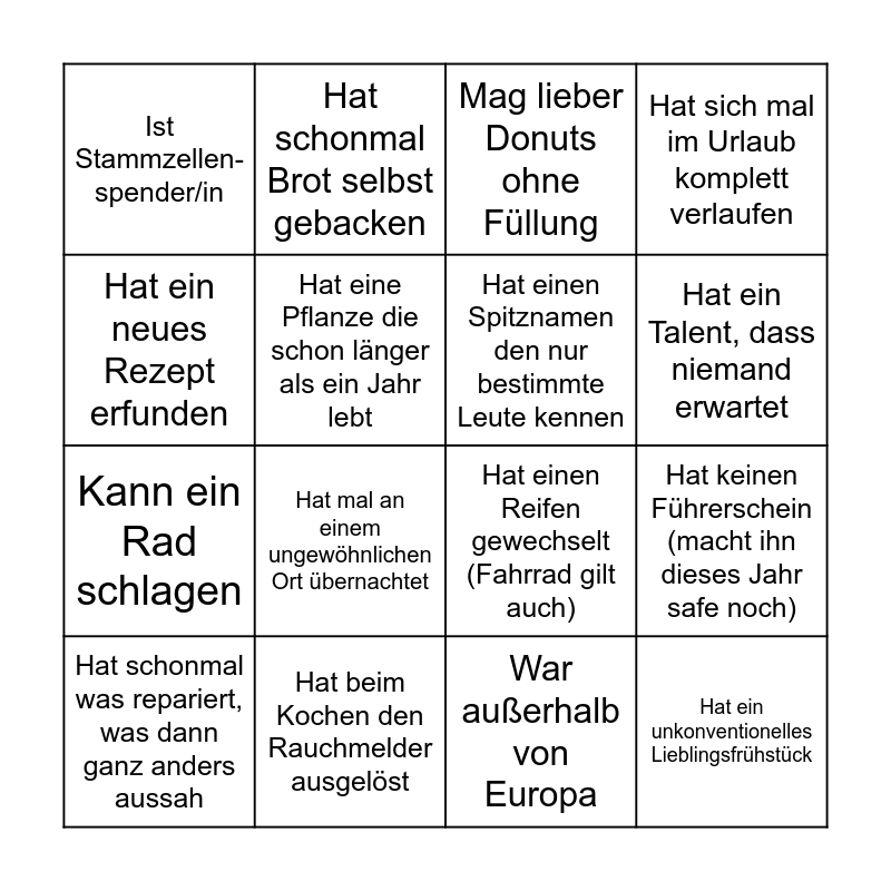 This bingo card has 16 words: Hat beim Kochen den Rauchmelder ausgelöst, Hat keinen Führerschein (macht ihn dieses Jahr safe noch), Mag lieber Donuts ohne Füllung, Ist Stammzellen- spender/in, Kann ein Rad schlagen, Hat schonmal Brot selbst gebacken, Hat einen Reifen gewechselt (Fahrrad gilt auch), War außerhalb von Europa, Hat ein neues Rezept erfunden, Hat eine Pflanze die schon länger als ein Jahr lebt, Hat schonmal was repariert, was dann ganz anders aussah, Hat sich mal im Urlaub komplett verlaufen, Hat mal an einem ungewöhnlichen Ort übernachtet, Hat ein Talent, dass niemand erwartet, Hat einen Spitznamen den nur bestimmte Leute kennen and Hat ein unkonventionelles Lieblingsfrühstück.