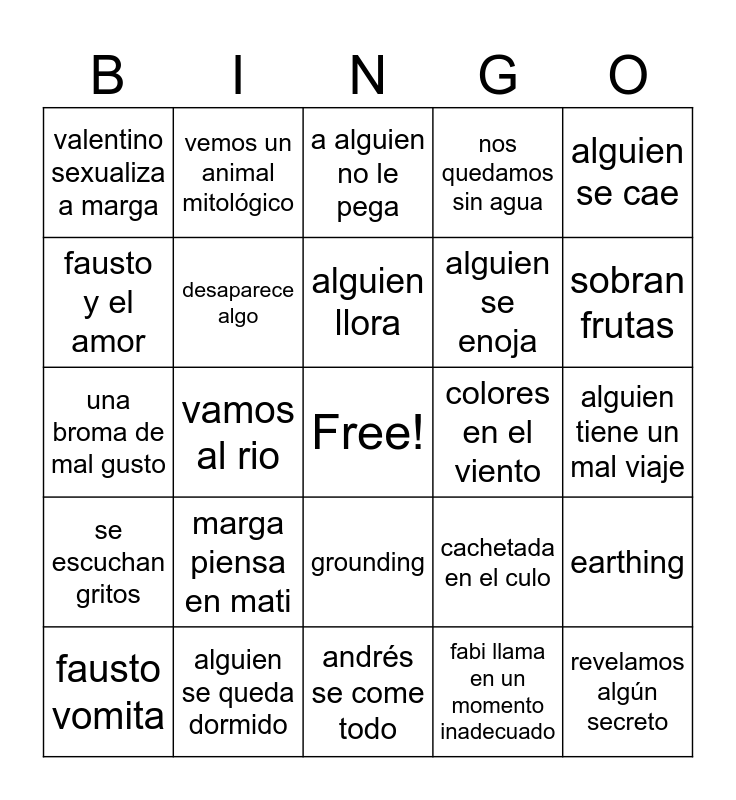 This bingo card has a free space and 24 words: marga piensa en mati, alguien se queda dormido, alguien llora, fausto vomita, alguien se cae, valentino sexualiza a marga, fausto y el amor, vemos un animal mitológico, colores en el viento, grounding, alguien se enoja, una broma de mal gusto, cachetada en el culo, earthing, desaparece algo, fabi llama en un momento inadecuado, alguien tiene un mal viaje, a alguien no le pega, sobran frutas, vamos al rio, revelamos algún secreto, se escuchan gritos, nos quedamos sin agua and andrés se come todo.