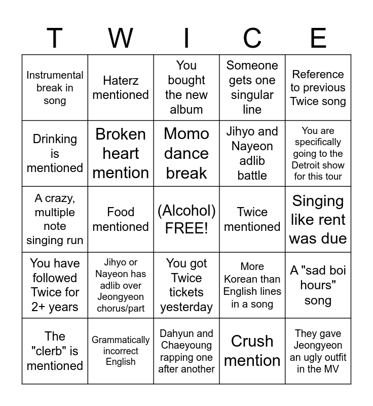 This bingo card has a free space and 24 words: Jihyo or Nayeon has adlib over Jeongyeon chorus/part, Grammatically incorrect English, Momo dance break, The "clerb" is mentioned, Reference to previous Twice song, Instrumental break in song, Drinking is mentioned, Haterz mentioned, Twice mentioned, You got Twice tickets yesterday, Jihyo and Nayeon adlib battle, A crazy, multiple note singing run, More Korean than English lines in a song, A "sad boi hours" song, Broken heart mention, Crush mention, Singing like rent was due, You bought the new album, You are specifically going to the Detroit show for this tour, Food mentioned, They gave Jeongyeon an ugly outfit in the MV, You have followed Twice for 2+ years, Someone gets one singular line and Dahyun and Chaeyoung rapping one after another.