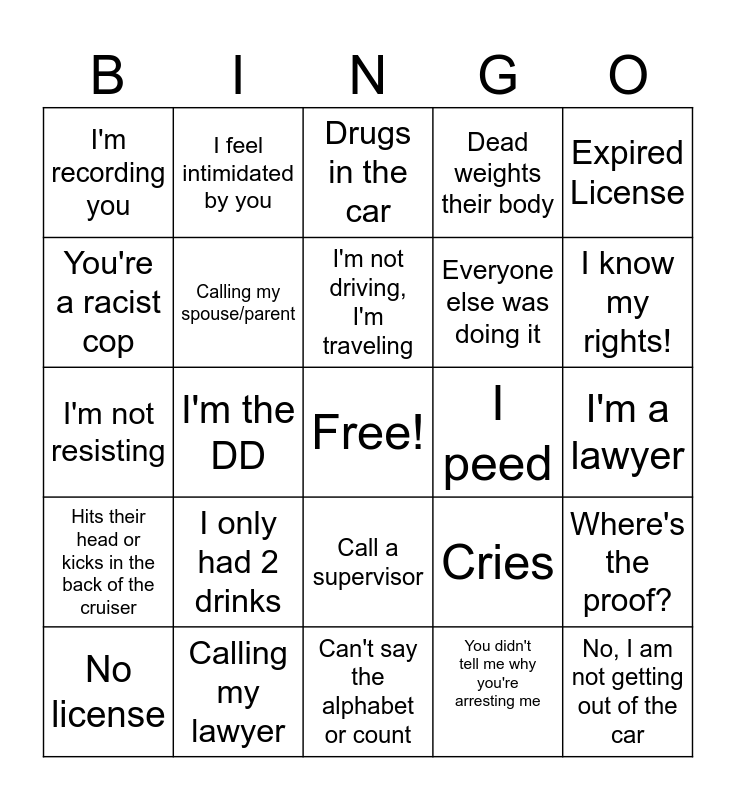 This bingo card has a free space and 24 words: I only had 2 drinks, Calling my lawyer, I'm not driving, I'm traveling, No license, Expired License, I'm recording you, You're a racist cop, I feel intimidated by you, I peed, Call a supervisor, Everyone else was doing it, I'm not resisting, Cries, Where's the proof?, Calling my spouse/parent, You didn't tell me why you're arresting me, I'm a lawyer, Drugs in the car, I know my rights!, I'm the DD, No, I am not getting out of the car, Hits their head or kicks in the back of the cruiser, Dead weights their body and Can't say the alphabet or count.