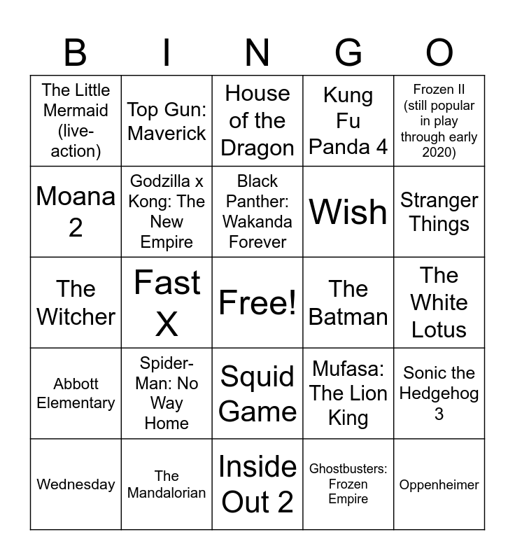 This bingo card has a free space and 48 words: Barbie, Oppenheimer, The Super Mario Bros. Movie, Inside Out 2, Spider-Man: No Way Home, Deadpool & Wolverine, Top Gun: Maverick, Dune: Part Two, Moana 2, Despicable Me 4, Godzilla x Kong: The New Empire, Kung Fu Panda 4, Sonic the Hedgehog 3, Mufasa: The Lion King, Avatar: The Way of Water, Wonka, Black Panther: Wakanda Forever, The Batman, Encanto, Frozen II (still popular in play through early 2020), Fast X, Ghostbusters: Frozen Empire, The Little Mermaid (live-action), Wish, Mission: Impossible – Dead Reckoning, Stranger Things, Wednesday, The Bear, Squid Game, Abbott Elementary, Loki, The Last of Us, Yellowstone, Only Murders in the Building, The Mandalorian, Ginny & Georgia, Ted Lasso, The White Lotus, Cobra Kai, Emily in Paris, Outer Banks, The Boys, House of the Dragon, Love Is Blind, The Witcher, Selling Sunset, The Crown and Wanda Vision.