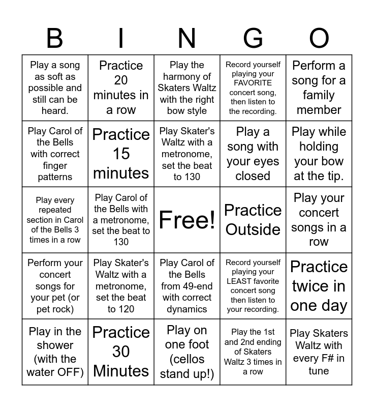 This bingo card has a free space and 24 words: Play Skater's Waltz with a metronome, set the beat to 120, Practice 30 Minutes, Play Skater's Waltz with a metronome, set the beat to 130, Play in the shower (with the water OFF), Perform a song for a family member, Play a song as soft as possible and still can be heard., Play Carol of the Bells with correct finger patterns, Practice 20 minutes in a row, Practice Outside, Play Carol of the Bells from 49-end with correct dynamics, Play a song with your eyes closed, Play every repeated section in Carol of the Bells 3 times in a row, Record yourself playing your LEAST favorite concert song then listen to your recording., Practice twice in one day, Practice 15 minutes, Play the 1st and 2nd ending of Skaters Waltz 3 times in a row, Play your concert songs in a row, Play the harmony of Skaters Waltz with the right bow style, Play while holding your bow at the tip., Play Carol of the Bells with a metronome, set the beat to 130, Play Skaters Waltz with every F# in tune, Perform your concert songs for your pet (or pet rock), Record yourself playing your FAVORITE concert song, then listen to the recording. and Play on one foot (cellos stand up!).