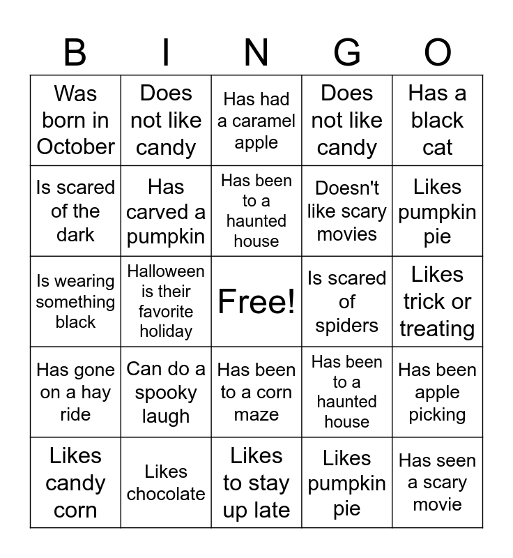 This bingo card has a free space and 24 words: Can do a spooky laugh, Likes chocolate, Has been to a haunted house, Likes candy corn, Has a black cat, Was born in October, Is scared of the dark, Does not like candy, Is scared of spiders, Has been to a corn maze, Doesn't like scary movies, Is wearing something black, Has been to a haunted house, Has been apple picking, Has carved a pumpkin, Likes pumpkin pie, Likes trick or treating, Has had a caramel apple, Likes pumpkin pie, Halloween is their favorite holiday, Has seen a scary movie, Has gone on a hay ride, Does not like candy and Likes to stay up late.