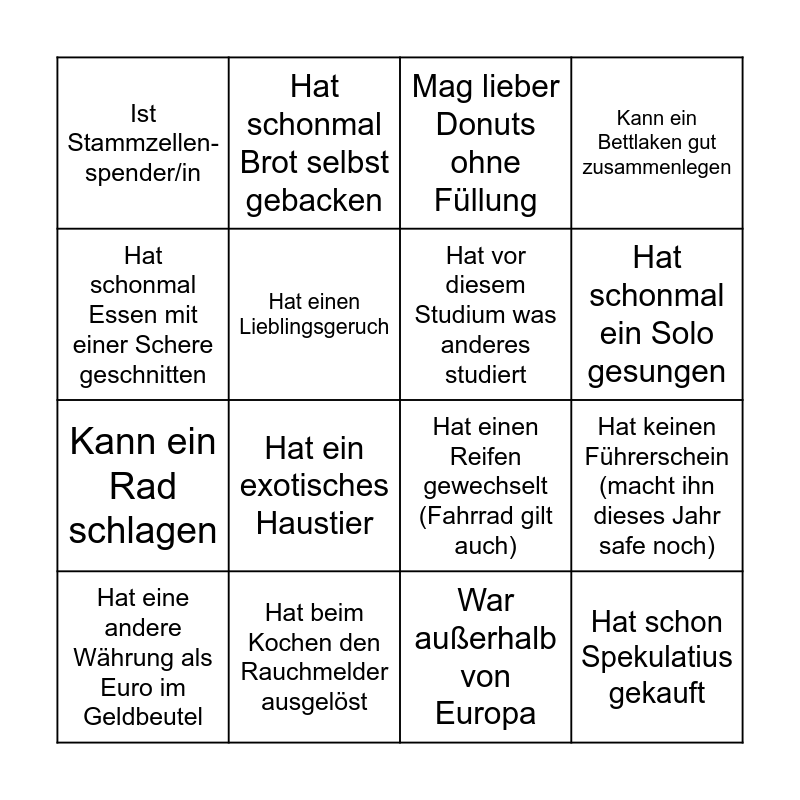 This bingo card has 16 words: Hat beim Kochen den Rauchmelder ausgelöst, Hat keinen Führerschein (macht ihn dieses Jahr safe noch), Mag lieber Donuts ohne Füllung, Ist Stammzellen- spender/in, Kann ein Rad schlagen, Hat schonmal Brot selbst gebacken, Hat einen Reifen gewechselt (Fahrrad gilt auch), War außerhalb von Europa, Hat schonmal Essen mit einer Schere geschnitten, Hat einen Lieblingsgeruch, Hat eine andere Währung als Euro im Geldbeutel, Kann ein Bettlaken gut zusammenlegen, Hat ein exotisches Haustier, Hat schonmal ein Solo gesungen, Hat vor diesem Studium was anderes studiert and Hat schon Spekulatius gekauft.