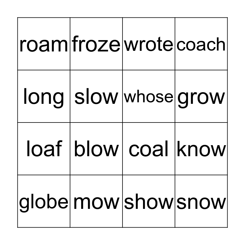 This bingo card has 16 words: mow, know, wrote, roam, loaf, froze, coal, show, long, slow, globe, coach, blow, grow, whose and snow.