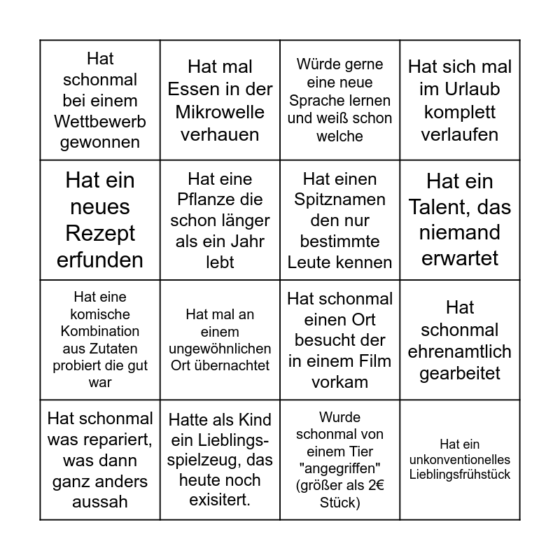 This bingo card has 16 words: Hatte als Kind ein Lieblings- spielzeug, das heute noch exisitert., Hat schonmal ehrenamtlich gearbeitet, Würde gerne eine neue Sprache lernen und weiß schon welche, Hat schonmal bei einem Wettbewerb gewonnen, Hat eine komische Kombination aus Zutaten probiert die gut war, Hat mal Essen in der Mikrowelle verhauen, Hat schonmal einen Ort besucht der in einem Film vorkam, Wurde schonmal von einem Tier "angegriffen" (größer als 2€ Stück), Hat ein neues Rezept erfunden, Hat eine Pflanze die schon länger als ein Jahr lebt, Hat schonmal was repariert, was dann ganz anders aussah, Hat sich mal im Urlaub komplett verlaufen, Hat mal an einem ungewöhnlichen Ort übernachtet, Hat ein Talent, das niemand erwartet, Hat einen Spitznamen den nur bestimmte Leute kennen and Hat ein unkonventionelles Lieblingsfrühstück.