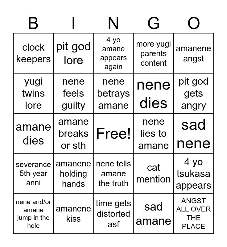 This bingo card has a free space and 24 words: amanene holding hands, amanene kiss, nene betrays amane, nene and/or amane jump in the hole, amanene angst, clock keepers, yugi twins lore, pit god lore, nene lies to amane, nene tells amane the truth, nene dies, amane dies, cat mention, 4 yo tsukasa appears, nene feels guilty, sad amane, sad nene, 4 yo amane appears again, pit god gets angry, amane breaks or sth, ANGST ALL OVER THE PLACE, severance 5th year anni, more yugi parents content and time gets distorted asf.
