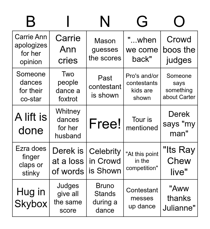 This bingo card has a free space and 34 words: A ten is scored, Contestant messes up dance, Dylan talks about his older brother and/or little sister, Prop is Used, Ezra does finger claps or stinky, Two people dance a foxtrot, Crowd boos the judges, Hug in Skybox, Carrie Ann cries, Someone scores a 7, Past contestant is shown, Mason guesses the scores, Someone cries in their opening package, Robert talks about his mom/dad, Tour is mentioned, Someone says something about Carter, Judges give all the same score, A lift is done, Derek is at a loss of words, "At this point in the competition", Celebrity in Crowd is Shown, Bruno says "My Darling", Carrie Ann apologizes for her opinion, Derek says "my man", Bruno Stands during a dance, "Aww thanks Julianne", "...when we come back", Judge standing ovation, Pro's and/or contestants kids are shown, Someone dances for their co-star, Judge peeks their head into camera frame, Whitney dances for her husband, "Its Ray Chew live" and Guest judge.