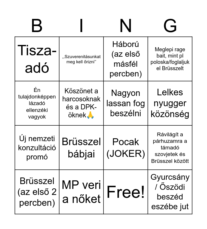 This bingo card has 17 words: Free!, Brüsszel (az első 2 percben), Háború (az első másfél percben), Tisza-adó, Brüsszel bábjai, Meglepi rage bait, mint pl poloska/foglaljuk el Brüsszelt, Rávilágít a párhuzamra a támadó szovjetek és Brüsszel között, Nagyon lassan fog beszélni, Lelkes nyugger közönség, Köszönet a harcosoknak és a DPK-öknek🙏, MP veri a nőket, Pocak (JOKER), Én tulajdonképpen lázadó ellenzéki vagyok, ,,Szuverenitásunkat meg kell őrizni’’, Új nemzeti konzultáció promó, Lakáshitel and Gyurcsány / Őszödi beszéd eszébe jut.