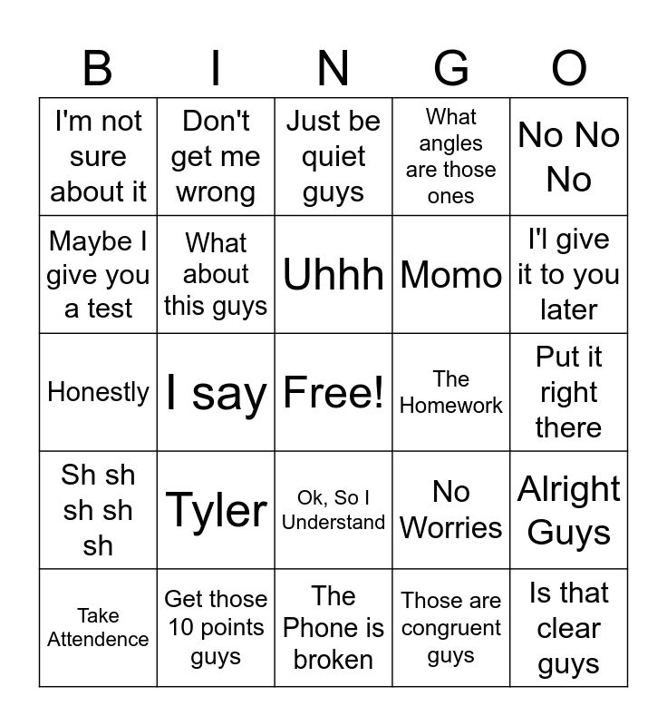 This bingo card has a free space and 25 words: Tyler, The Phone is broken, Uhhh, Take Attendence, No No No, I'm not sure about it, Maybe I give you a test, Don't get me wrong, The Homework, Ok, So I Understand, Momo, Honestly, No Worries, Alright Guys, What about this guys, Go into schoology, Put it right there, Just be quiet guys, I'l give it to you later, I say, Is that clear guys, Get those 10 points guys, Sh sh sh sh sh, What angles are those ones and Those are congruent guys.