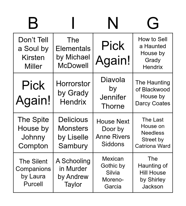 This bingo card has 16 words: A Schooling in Murder by Andrew Taylor, The Last House on Needless Street by Catriona Ward, Pick Again!, Don’t Tell a Soul by Kirsten Miller, The Spite House by Johnny Compton, The Elementals by Michael McDowell, House Next Door by Anne Rivers Siddons, Mexican Gothic by Silvia Moreno-Garcia, Pick Again!, Horrorstor by Grady Hendrix, The Silent Companions by Laura Purcell, How to Sell a Haunted House by Grady Hendrix, Delicious Monsters by Liselle Sambury, The Haunting of Blackwood House by Darcy Coates, Diavola by Jennifer Thorne and The Haunting of Hill House by Shirley Jackson.