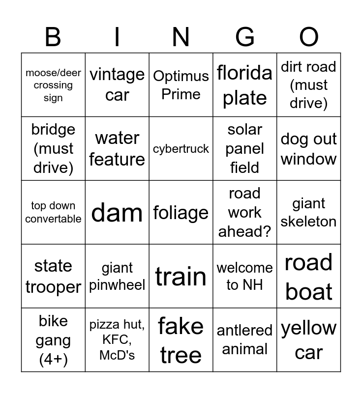 This bingo card has a free space and 34 words: airplane (taking off/landing), antlered animal, horses AND cows, tunnel (must drive), state trooper, water feature, dirt road (must drive), bike gang (4+), vintage car, giant marshmallows, cybertruck, Optimus Prime, toy story clouds, ghibli clouds, road work ahead?, dog out window, pizza hut, KFC, McD's, top down convertable, giant pinwheel, welcome to NH, train, grain silo, moose/deer crossing sign, giant skeleton, fake tree, yellow car, florida plate, red barn, solar panel field, bridge (must drive), water tower, dam, road boat and eagle.