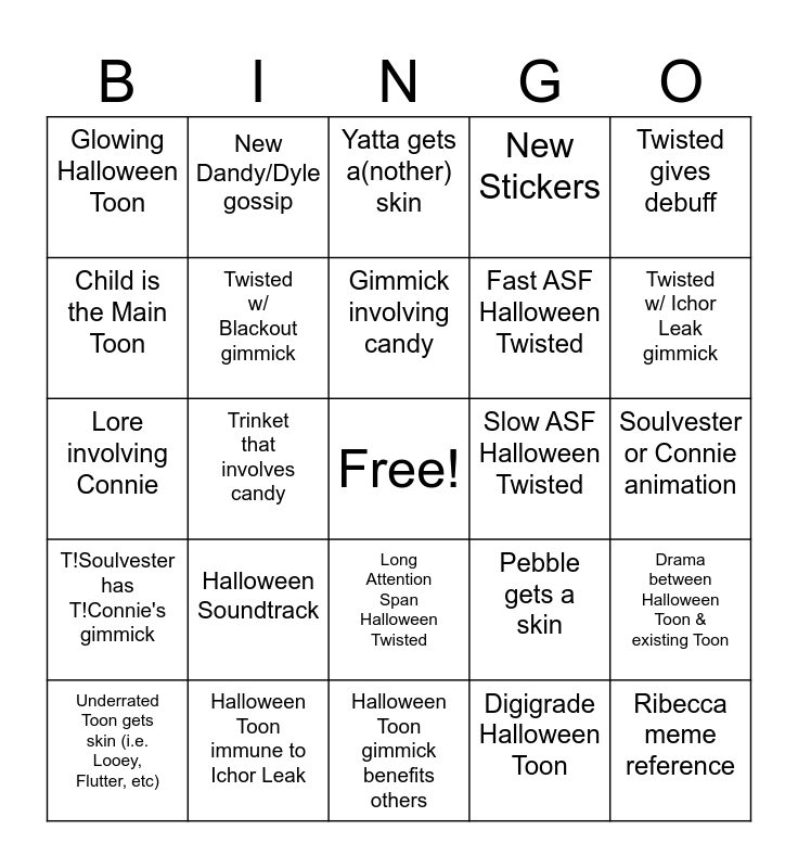 This bingo card has a free space and 24 words: Halloween Soundtrack, Halloween Toon immune to Ichor Leak, Gimmick involving candy, Underrated Toon gets skin (i.e. Looey, Flutter, etc), Twisted gives debuff, Glowing Halloween Toon, Child is the Main Toon, New Dandy/Dyle gossip, Slow ASF Halloween Twisted, Long Attention Span Halloween Twisted, Fast ASF Halloween Twisted, Lore involving Connie, Pebble gets a skin, Drama between Halloween Toon & existing Toon, Twisted w/ Blackout gimmick, Digigrade Halloween Toon, Soulvester or Connie animation, Yatta gets a(nother) skin, Twisted w/ Ichor Leak gimmick, Trinket that involves candy, Ribecca meme reference, T!Soulvester has T!Connie's gimmick, New Stickers and Halloween Toon gimmick benefits others.