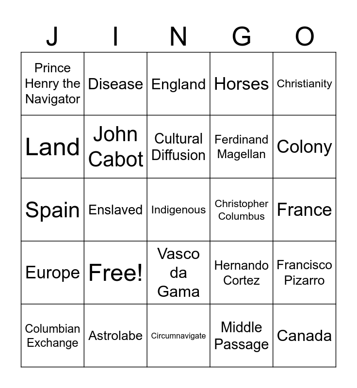 This bingo card has 25 words: Free!, Circumnavigate, Cultural Diffusion, Columbian Exchange, Christianity, Prince Henry the Navigator, Land, Disease, Christopher Columbus, Vasco da Gama, Ferdinand Magellan, Spain, Hernando Cortez, Francisco Pizarro, John Cabot, Canada, France, England, Colony, Enslaved, Indigenous, Astrolabe, Europe, Horses and Middle Passage.