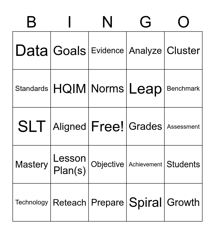 This bingo card has a free space and 25 words: Lesson Plan(s), Prepare, Norms, Technology, Cluster, Data, Standards, Goals, Grades, Objective, Leap, SLT, Achievement, Students, HQIM, Skills, Assessment, Evidence, Benchmark, Aligned, Growth, Reteach, Mastery, Analyze and Spiral.