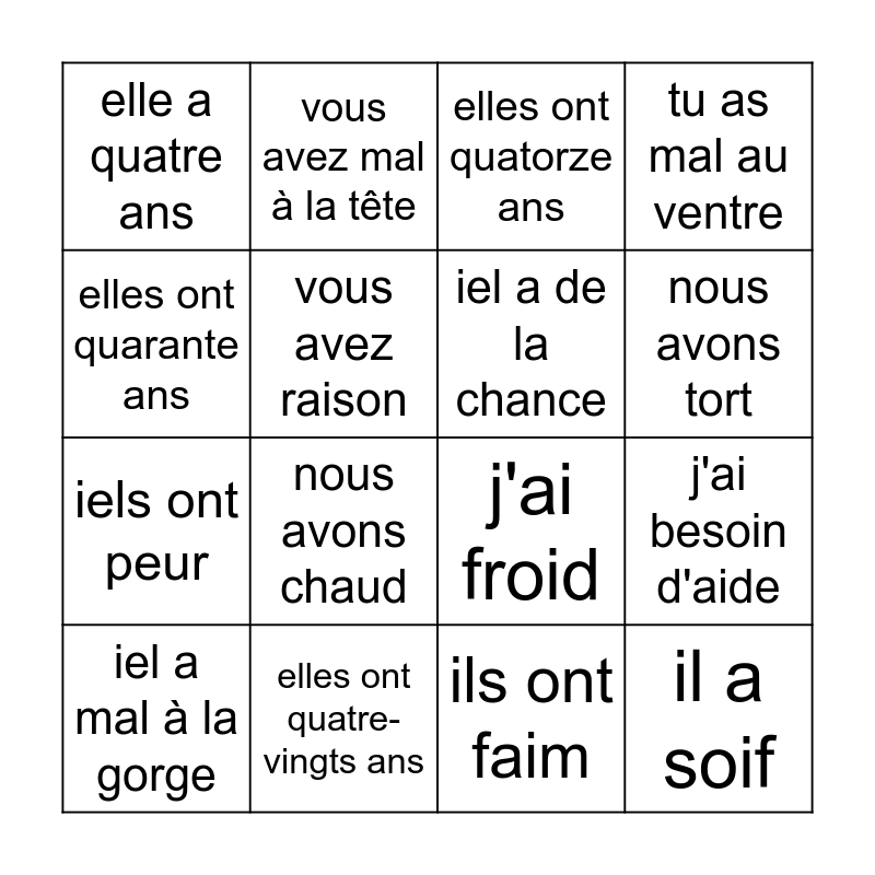 This bingo card has 18 words: nous avons chaud, il a soif, elles ont quatorze ans, elle a quatre ans, j'ai froid, tu as mal au ventre, iel a mal à la gorge, vous avez mal à la tête, nous avons tort, iels ont peur, ils ont faim, elles ont quarante ans, j'ai besoin d'aide, vous avez raison, iel a de la chance, tu as envie de voyager, elles ont quatre-vingts ans and il a envie de dormir.