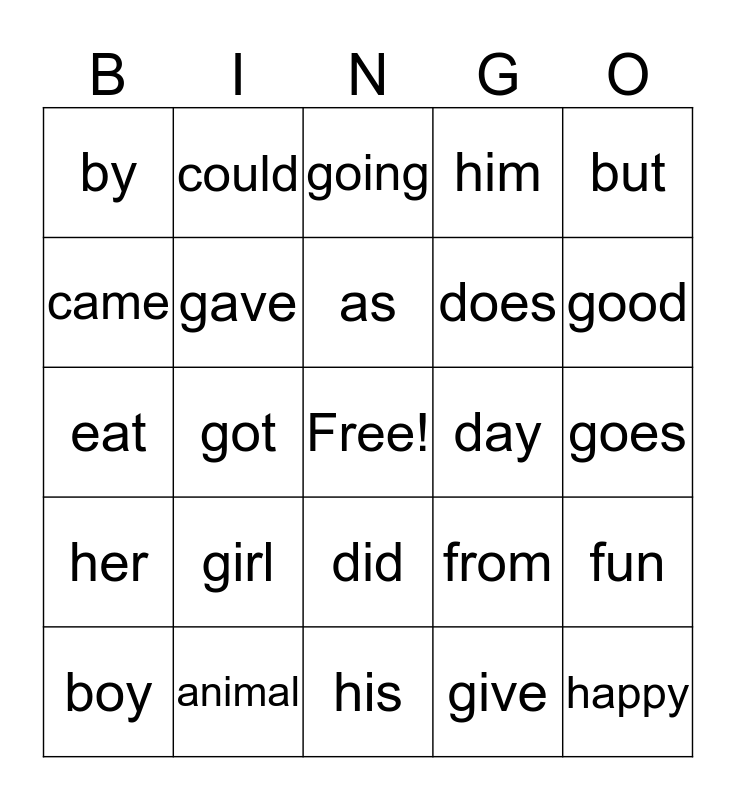 This bingo card has a free space and 24 words: girl, animal, as, boy, but, by, came, could, day, did, does, eat, from, fun, gave, give, goes, going, good, got, happy, her, him and his.