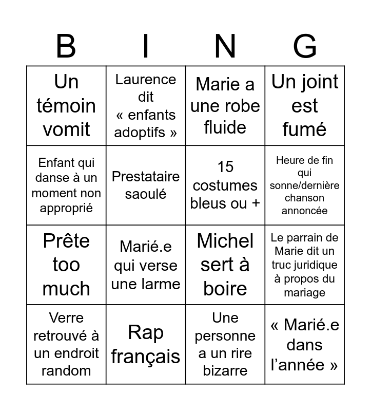 This bingo card has 16 words: Rap français, Le parrain de Marie dit un truc juridique à propos du mariage, Marie a une robe fluide, Un témoin vomit, Prête too much, Laurence dit « enfants adoptifs », Michel sert à boire, Une personne a un rire bizarre, Enfant qui danse à un moment non approprié, Prestataire saoulé, Verre retrouvé à un endroit random, Un joint est fumé, Marié.e qui verse une larme, Heure de fin qui sonne/dernière chanson annoncée, 15 costumes bleus ou + and « Marié.e dans l’année ».