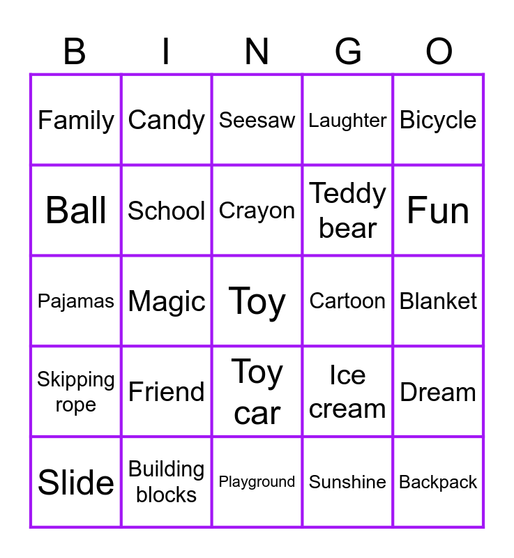 This bingo card has 49 words: Free!, Toy, Game, Playground, Friend, Smile, Candy, Birthday, Ball, Story, School, Laughter, Dream, Ice cream, Balloon, Swing, Crayon, Cartoon, Doll, Bicycle, Magic, Sunshine, Family, Teddy bear, Rainbow, Fun, Slide, Sandbox, Toy car, Skipping rope, Puppet, Puzzle, Kite, Hide-and-seek, Building blocks, Coloring book, Nap, Cookie, Blanket, Playground, Merry-go-round, Nursery, Backpack, Chalk, Pajamas, Seesaw, Sticker, Giggle and Hula hoop.