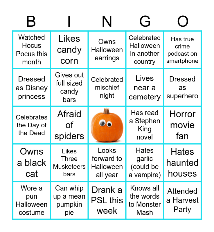 This bingo card has a free space and 24 words: Likes Three Musketeers bars, Can whip up a mean pumpkin pie, Celebrated mischief night, Wore a pun Halloween costume, Has true crime podcast on smartphone, Watched Hocus Pocus this month, Dressed as Disney princess, Likes candy corn, Has read a Stephen King novel, Looks forward to Halloween all year, Lives near a cemetery, Celebrates the Day of the Dead, Hates garlic (could be a vampire), Hates haunted houses, Gives out full sized candy bars, Knows all the words to Monster Mash, Horror movie fan, Owns Halloween earrings, Dressed as superhero, Afraid of spiders, Attended a Harvest Party, Owns a black cat, Celebrated Halloween in another country and Drank a PSL this week.