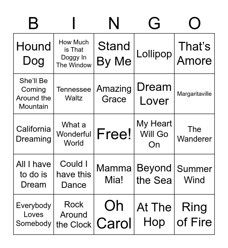 This bingo card has a free space and 76 words: Dancing Queen, Voulez Vous, Stand By Me, Sweet Caroline, 9-5, Fly Me To The Moon, You Are My Sunshine, Somewhere Over the Rainbow, Que Sera, Sera, Yellow Submarine, Can’t Help Falling in Love, Edelweiss, Amazing Grace, She’ll Be Coming Around the Mountain, Singing in the Rain, What a Wonderful World, Blue Suede Shoes, Ring of Fire, Leaving on a Jet Plane, That’s Amore, Under the Boardwalk, California Dreaming, Tennessee Waltz, How Much is That Doggy In The Window, Lollipop, All Shook Up, Walkin’ After Midnight, Crazy - Patsy Cline, Put Your Head On My Shoulder, Mr. Sandman, I Walk The Line, Rockin’ Robin, You Send Me, Beyond the Sea, Margaritaville, Dream Lover, Jailhouse Rock, Surfin’ USA, The Wanderer, At The Hop, At Last, I Say A Little Prayer, Oh, Pretty Woman, It’s A Long Way To Tipperary, Sh-Boom (Life Could Be a Dream), Be My Baby, Everybody Loves Somebody, Hound Dog, My Way, King of the Road, Let Me Call You Sweetheart, Mamma Mia!, These Boots are Made for Walking, I’m a Believer, Wild Thing, Lucille, Yesterday, Let It Be, Cracklin’ Rosie, Unchain my Heart, Could I have this Dance, What’s Love Got to Do With It?, Country Roads, Love Me Tender, Bennie and The Jets, With A Little Help From My Friends, My Heart Will Go On, Ain’t That a Kick in The Head, Welcome To My World, Hit The Road Jack, Summer Wind, All I have to do is Dream, Rock Around the Clock, The Sound of Silence, Oh Carol and Blueberry Hill.