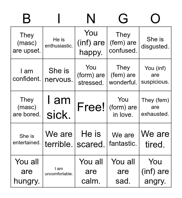 This bingo card has a free space and 27 words: We are fantastic., They (masc) are excited., They (fem) are wonderful., You all are calm., I am confident., You (inf) are happy., He is enthusiastic., She is entertained., You (form) are in love., We are tired., They (masc) are bored., They (fem) are confused., You all are hungry., I am uncomfortable., You (inf) are suspicious., He is worried., She is nervous., You (form) are stressed., We are terrible., They (masc) are upset., They (fem) are exhausted., You all are sad., I am sick., You (inf) are angry., He is scared., She is disgusted. and You (form) are embarassed..