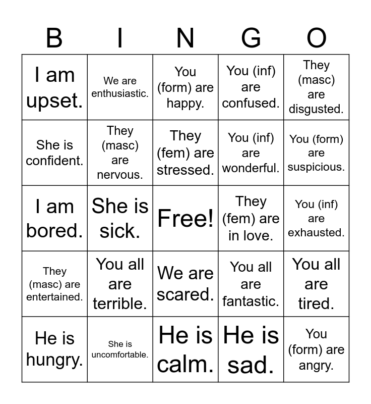 This bingo card has a free space and 27 words: You all are fantastic., I am excited., You (inf) are wonderful., He is calm., She is confident., You (form) are happy., We are enthusiastic., They (masc) are entertained., They (fem) are in love., You all are tired., I am bored., You (inf) are confused., He is hungry., She is uncomfortable., You (form) are suspicious., We are worried., They (masc) are nervous., They (fem) are stressed., You all are terrible., I am upset., You (inf) are exhausted., He is sad., She is sick., You (form) are angry., We are scared., They (masc) are disgusted. and They (fem) are embarassed..