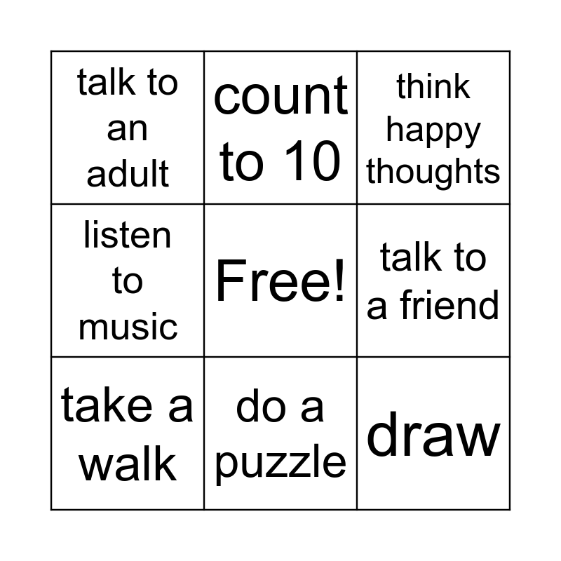 This bingo card has a free space and 12 words: take a drink of water, go outside, draw, talk to a friend, count to 10, think happy thoughts, do a puzzle, read a book, talk to an adult, listen to music, take a walk and take deep breaths.