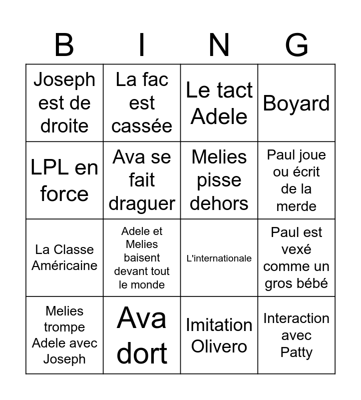 This bingo card has 16 words: Ava dort, Paul est vexé comme un gros bébé, Le tact Adele, Joseph est de droite, La Classe Américaine, La fac est cassée, L'internationale, Imitation Olivero, LPL en force, Ava se fait draguer, Melies trompe Adele avec Joseph, Boyard, Adele et Melies baisent devant tout le monde, Paul joue ou écrit de la merde, Melies pisse dehors and Interaction avec Patty.