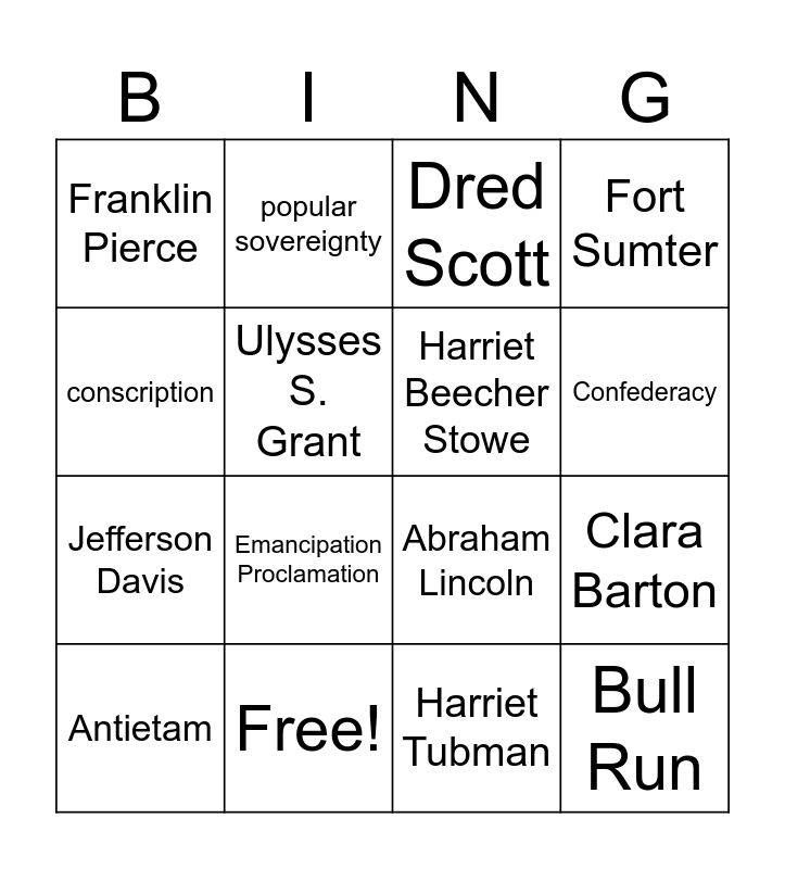 This bingo card has 21 words: Free!, Secession, popular sovereignty, Underground railroad, Harriet Tubman, Harriet Beecher Stowe, Franklin Pierce, Dred Scott, Abraham Lincoln, Confederacy, Jefferson Davis, Fort Sumter, Bull Run, Stonewall Jackson, Ulysses S. Grant, Robert E. Lee, Antietam, Emancipation Proclamation, conscription, Clara Barton and income tax.