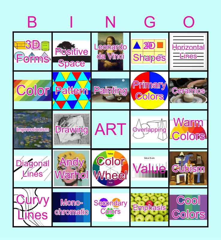 This bingo card has 54 images, a free space and 54 words: Pop Art, Diagonal Lines, Line, Vertical Lines, Color Wheel, Organic Shapes, 2D Shapes, Texture, Color, Abstract Art, 3D Forms, Zig Zag Lines, Mono-chromatic, Curvy Lines, Geometric Shapes, Secondary Colors, Cool Colors, Primary Colors, Complement- ary Colors, Warm Colors, Value, Analogous Colors, Overlapping, Horizontal Lines, Negative Space, Positive Space, Symmetrical Balance, Radial Balance, Contrast, Emphasis, Rhythm, Movement, Unity, Variety, Leonardo da Vinci, Realism, Impressionism, Cubism, Surrealism, Pattern, Georgia O'Keeffe, Vincent van Gogh, Chuck Close, Pablo Picasso, Andy Warhol, Salvador Dali, Collage, Sculpture, Painting, Drawing, Ceramics, Piet Mondrian, Op Art and Pointillism.