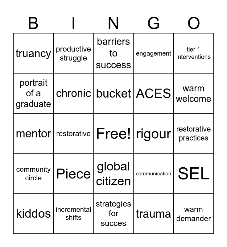 This bingo card has a free space and 24 words: Piece, incremental shifts, bucket, kiddos, tier 1 interventions, truancy, portrait of a graduate, productive struggle, rigour, global citizen, ACES, mentor, communication, SEL, chronic, trauma, restorative practices, barriers to success, warm welcome, restorative, warm demander, community circle, engagement and strategies for succes.
