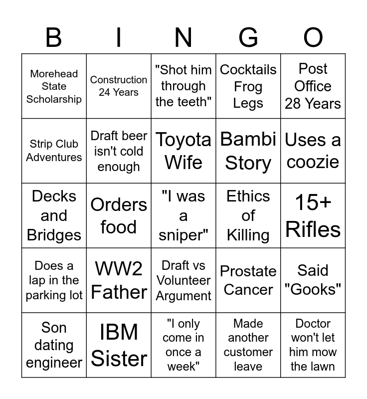 This bingo card has a free space and 24 words: WW2 Father, IBM Sister, Toyota Wife, Son dating engineer, Post Office 28 Years, Morehead State Scholarship, Strip Club Adventures, Construction 24 Years, Ethics of Killing, Draft vs Volunteer Argument, Bambi Story, Decks and Bridges, Prostate Cancer, Said "Gooks", Draft beer isn't cold enough, Made another customer leave, 15+ Rifles, "Shot him through the teeth", Uses a coozie, Orders food, Doctor won't let him mow the lawn, Does a lap in the parking lot, Cocktails Frog Legs and "I only come in once a week".