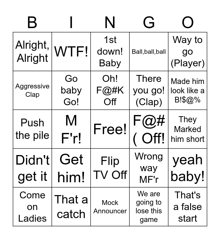 This bingo card has a free space and 25 words: Get him!, Mock Announcer, Oh! F@#K Off, Come on Ladies, Way to go (Player), Alright, Alright, Aggressive Clap, WTF!, F@#( Off!, Flip TV Off, There you go!(Clap), Push the pile, Wrong way MF'r, yeah baby!, Go baby Go!, Get there!, They Marked him short, 1st down! Baby, Made him look like a B!$@%, M F'r!, That's a false start, That a catch, Didn't get it, Ball,ball,ball and We are going to lose this game.