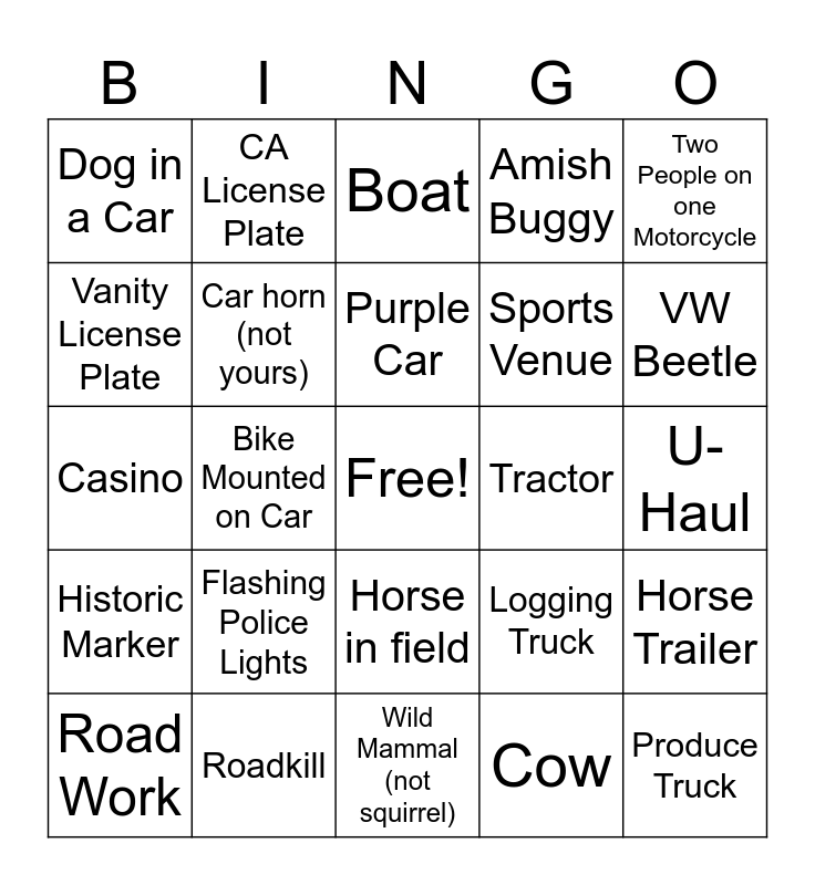 This bingo card has a free space and 24 words: Flashing Police Lights, Roadkill, Purple Car, Road Work, Two People on one Motorcycle, Dog in a Car, Vanity License Plate, CA License Plate, Tractor, Horse in field, Sports Venue, Casino, Logging Truck, Horse Trailer, Car horn (not yours), Cow, U-Haul, Boat, VW Beetle, Bike Mounted on Car, Produce Truck, Historic Marker, Amish Buggy and Wild Mammal (not squirrel).