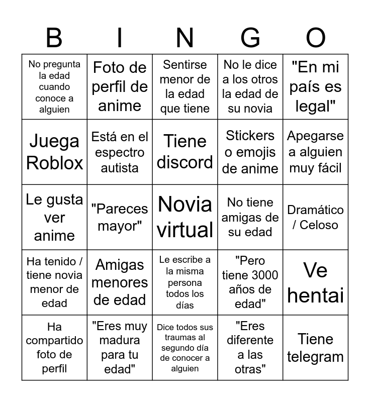 This bingo card has a free space and 24 words: Amigas menores de edad, "Eres muy madura para tu edad", Tiene discord, Ha compartido foto de perfil, "En mi país es legal", No pregunta la edad cuando conoce a alguien, Juega Roblox, Foto de perfil de anime, No tiene amigas de su edad, Le escribe a la misma persona todos los días, Stickers o emojis de anime, Le gusta ver anime, "Pero tiene 3000 años de edad", Ve hentai, Está en el espectro autista, "Eres diferente a las otras", Dramático / Celoso, Sentirse menor de la edad que tiene, Apegarse a alguien muy fácil, "Pareces mayor", Tiene telegram, Ha tenido / tiene novia menor de edad, No le dice a los otros la edad de su novia and Dice todos sus traumas al segundo día de conocer a alguien.