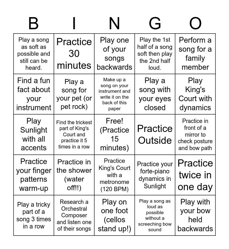 This bingo card has a free space and 24 words: Practice in the shower (water off!!), Research a Orchestral Composer and listen one of their songs, Make up a song on your instrument and write it on the back of this paper, Play a tricky part of a song 3 times in a row, Perform a song for a family member, Play a song as soft as possible and still can be heard., Find a fun fact about your instrument, Practice 30 minutes, Practice Outside, Practice King's Court with a metronome (120 BPM), Play a song with your eyes closed, Play Sunlight with all accents, Practice your forte-piano dynamics in Sunlight, Practice twice in one day, Play a song for your pet (or pet rock), Play a song as loud as possible without a screeching bow sound, Practice in front of a mirror to check posture and bow path, Play one of your songs backwards, Play King's Court with dynamics, Find the trickest part of King's Court and practice it 5 times in a row, Play with your bow held backwards, Practice your finger patterns warm-up, Play the 1st half of a song soft then play the 2nd half loud. and Play on one foot (cellos stand up!).