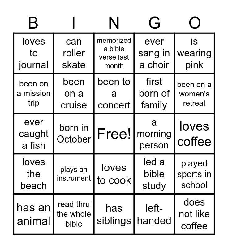 This bingo card has a free space and 24 words: plays an instrument, read thru the whole bible, been to a concert, has an animal, is wearing pink, loves to journal, been on a mission trip, can roller skate, a morning person, loves to cook, first born of family, ever caught a fish, led a bible study, played sports in school, been on a cruise, left-handed, loves coffee, memorized a bible verse last month, been on a women's retreat, born in October, does not like coffee, loves the beach, ever sang in a choir and has siblings.