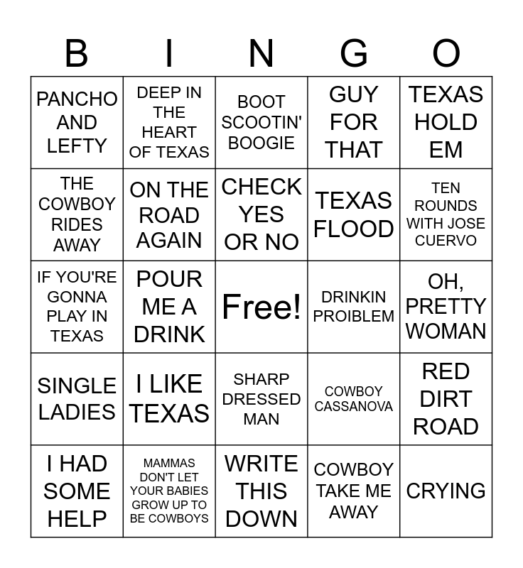 This bingo card has a free space and 41 words: AMARILLO BY MORNING, IF YOU'RE GONNA PLAY IN TEXAS, ALL MY EX'S LIVE IN TEXAS, ON THE ROAD AGAIN, MAMMAS DON'T LET YOUR BABIES GROW UP TO BE COWBOYS, SHARP DRESSED MAN, CHECK YES OR NO, HERE FOR A GOOD TIME, TEXAS HOLD EM, SINGLE LADIES, POUR ME A DRINK, GUY FOR THAT, CRYING, OH, PRETTY WOMAN, DRINKIN PROIBLEM, I LIKE TEXAS, WHITEHOUSE ROAD, PANCHO AND LEFTY, NEON MOON, BOOT SCOOTIN' BOOGIE, RED DIRT ROAD, MY MARIA, WRITE THIS DOWN, TEXAS FLOOD, GOD BLESSED TEXAS, SHOULD'VE BEEN A COWBOY, COWBOY TAKE ME AWAY, GOODBYE EARL, TEN ROUNDS WITH JOSE CUERVO, BEER FOR MY HORSES, AUSTIN, DEEP IN THE HEART OF TEXAS, I HAD SOME HELP, ROCKSTAR, COWBOY CASSANOVA, THE COWBOY RIDES AWAY, DALLAS, THEME FROM DALLAS, WE DEM BOYZ, FRIENDS IN LOW PLACES and THE THUNDER ROLLS.