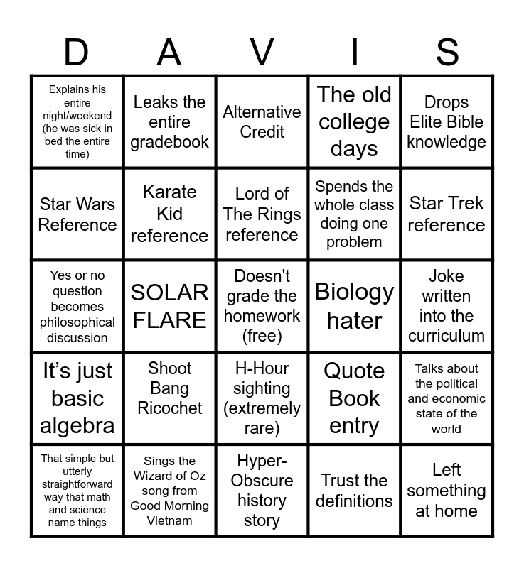 This bingo card has a free space and 24 words: Shoot Bang Ricochet, Sings the Wizard of Oz song from Good Morning Vietnam, Lord of The Rings reference, That simple but utterly straightforward way that math and science name things, Drops Elite Bible knowledge, Explains his entire night/weekend (he was sick in bed the entire time), Star Wars Reference, Leaks the entire gradebook, Biology hater, H-Hour sighting (extremely rare), Spends the whole class doing one problem, Yes or no question becomes philosophical discussion, Quote Book entry, Talks about the political and economic state of the world, Karate Kid reference, Trust the definitions, Joke written into the curriculum, Alternative Credit, Star Trek reference, SOLAR FLARE, Left something at home, It’s just basic algebra, The old college days and Hyper-Obscure history story.