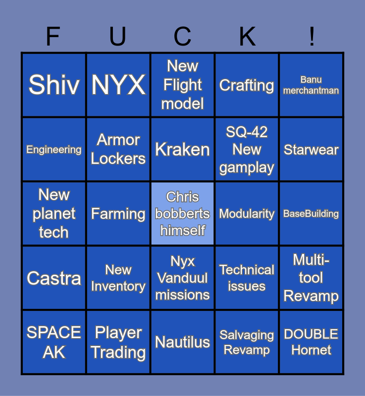 This bingo card has a free space and 24 words: New Inventory, Player Trading, Kraken, SPACE AK, Banu merchantman, Shiv, Engineering, NYX, Modularity, Nyx Vanduul missions, SQ-42 New gamplay, New planet tech, Technical issues, Multi-tool Revamp, Armor Lockers, Salvaging Revamp, BaseBuilding, New Flight model, Starwear, Farming, DOUBLE Hornet, Castra, Crafting and Nautilus.