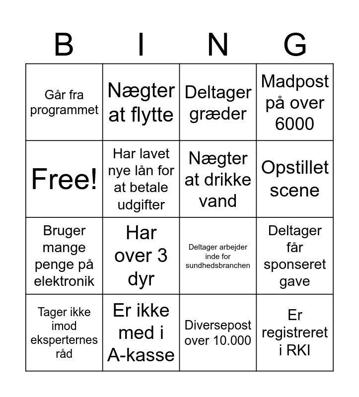 This bingo card has 70 words: Gæld til familie, Diversepost over 10.000, Par giver hinanden skylden, Vil ikke sælge bilen, Bliver kaldt teenager, Kan ikke få lagt et nyt budget, Madpost på over 6000, Er gambler, Free!, Køber meget tøj, Låner penge til rejser, Har over 20 kreditorer, Går fra programmet, Deltager græder, Holder det nye budget, Deltager får sponseret gave, Deltager bliver sur på ekspert, Bruger mange penge på elektronik, Har en alt for høj boligpost, Er registreret i RKI, Er ikke med i A-kasse, Har ingen forsikringer, Har over 3 dyr, Har løjet for sin partner, Nogen siger" Det var mange penge", Nogen siger " Jeg vidste ikke at det var så slemt", Undervurdere hvor meget de skylder med 50%, Udkantsdanmark, Betaler ikke børnebidrag, Har gammel gæld med eks, Nægter at flytte, Har 2 lejligheder/huse, Er blevet meldt til af venner/familie, Skal slå noget i stykker ved kreativt indslag, Viser eksempel ved at fylde trillebør eller andet med mad, Skal ringe til familie, Skal ringe til kreditorer, Sammenført familie, Betaler på afbetaling, Har lavet nye lån for at betale udgifter, Har ikke betalt husleje, Har flyttet flere gange på få år, Tager ikke imod eksperternes råd, Par går fra hinanden, Absurd kreativ eksempel, Nægter at drikke vand, Nægter at stoppe med at ryge, Bruger stadig mange penge på fastfood ved genbesøg, Spydig bemærkning fra ekspert eller ven/familie, Speciel budget post, Deltager mangler overblik, "Facade", En sang for sin syge moster, Deltager ignorerer regninger, Deltager er under 25 år gammel, Samlet gæld på en halv million eller mere, Opstillet scene, Cringe scene, Deltager får ros, Gældfri om 5-10 år, Deltager arbejder inde for sundhedsbranchen, Bruger mange penge på dyr, har en relativ høj indkomst, Spiser meget ude/fastfood, Har en dyr hobby, Deltager har bolig med eks, Deltager forlader rummet, Deltager tager offerrollen, Eksperter har skåret en stor del af gælden af. and Eksperterne finder job til deltager.