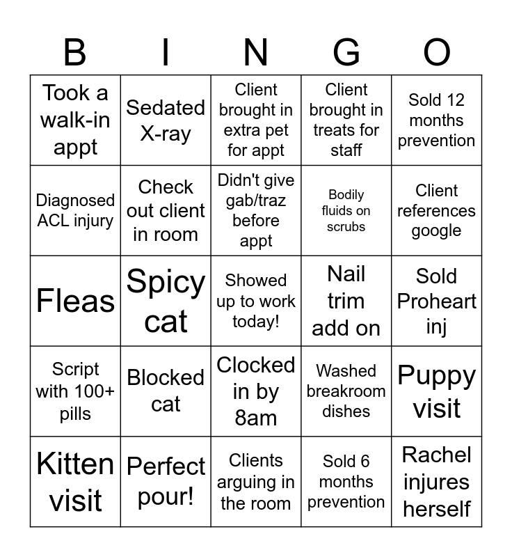 This bingo card has a free space and 24 words: Blocked cat, Perfect pour!, Didn't give gab/traz before appt, Kitten visit, Sold 12 months prevention, Took a walk-in appt, Diagnosed ACL injury, Sedated X-ray, Nail trim add on, Clocked in by 8am, Bodily fluids on scrubs, Fleas, Washed breakroom dishes, Puppy visit, Check out client in room, Sold 6 months prevention, Sold Proheart inj, Client brought in extra pet for appt, Client references google, Spicy cat, Rachel injures herself, Script with 100+ pills, Client brought in treats for staff and Clients arguing in the room.
