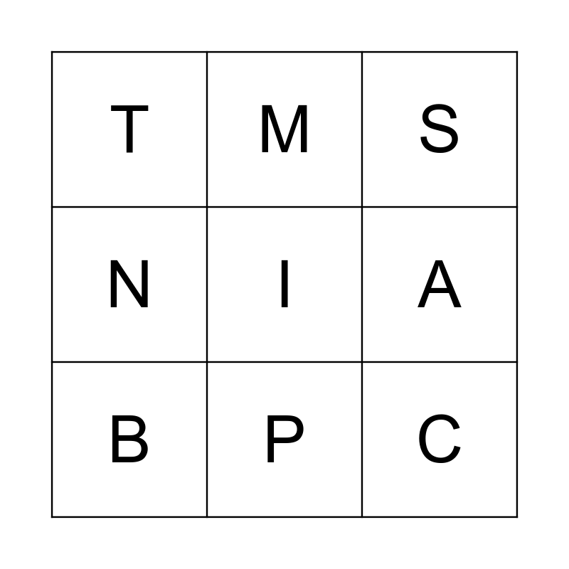 This bingo card has a free space and 8 words: A, S, M, B, T, C, N and P.