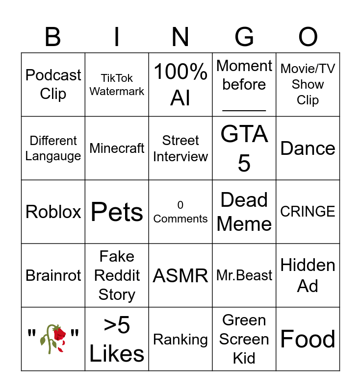 This bingo card has 25 words: Brainrot, >5 Likes, 0 Comments, Green Screen Kid, Movie/TV Show Clip, Podcast Clip, TikTok Watermark, 100% AI, Dead Meme, Hidden Ad, Different Langauge, Minecraft, Ranking, Mr.Beast, Dance, "🥀", Pets, Street Interview, GTA 5, CRINGE, Roblox, Fake Reddit Story, ASMR, Moment before _____ and Food.