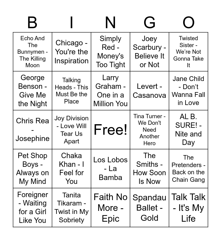 This bingo card has a free space and 98 words: A-Ha - Take On Me, Zapp - More Bounce to the Ounce, A-Ha - The Living Daylights, AL B. SURE! - Nite and Day, Adrian Gurvitz - Classic, Al Jarreau - Mornin', Alannah Myles - Black Velvet, Alphaville - Big in Japan, Alphaville - Forever Young, Art Of Noise - Kiss, Belouis Some - Imagination, Bette Midler - Wind Beneath My Wings, Chaka Khan - Ain't Nobody, Chaka Khan - I Feel for You, Chicago - Hard to Say I’m Sorry, Chicago - You're the Inspiration, Chris Rea - Josephine, Cliff Richard - Ocean Deep, Climie Fisher - Love Changes, Debbie Gibson - Lost in Your Eyes, Dexys - Geno, Donald Fagen - I.G.Y., Duran Duran - Girls on Film, Duran Duran - Hungry like the Wolf, Dusty Springfield - In Private, Echo And The Bunnymen - The Killing Moon, Faith No More - Epic, Fleetwood Mac - Everywhere, Fleetwood Mac - Little Lies, Foreigner - I Want to Know What Love Is, Foreigner - Waiting for a Girl Like You, George Benson - Give Me the Night, Hot Chocolate - It Started with a Kiss, James Ingram - There’s No Easy Way, Jane Child - Don’t Wanna Fall in Love, Jane’s Addiction - Jane Says, Joey Scarbury - Believe It or Not, John Parr - St. Elmo's Fire, Joy Division - Love Will Tear Us Apart, Kajagoogoo - Too Shy, Karyn White - Superwoman, Larry Graham - One in a Million You, Levert - Casanova, Limahl - Never Ending Story, London Boys - I'm Gonna Give My Heart, Los Lobos - La Bamba, Madonna - La Isla Bonita, Madonna - Like a Prayer, Marillion - Kayleigh, Michael McDonald - I Keep Forgettin, Narada Michael Walden - Gimme Gimme Gimme, New Order - Blue Monday '88, Nu Shooz - I Can’t Wait, Peabo Bryson - If Ever You're in My Arms Again, Peter Cetera - Glory of Love, Peter Schilling - Major Tom, Pet Shop Boys - Always on My Mind, Pet Shop Boys - What Have I Done to Deserve This, Ramones - Baby, I Love You, Randy Crawford - You Might Need Somebody, Richie Havens - Going Back to My Roots, Robert Palmer - Simply Irresistible, Roberta Flack - Back Together Again, Rod Stewart - Baby Jane, Rod Stewart - Young Turks, Roger - I Want to Be Your Man, Roxette - Dressed for Success, Roxette - The Look, Sheila E. - The Glamorous Life, Simply Red - Holding Back the Years, Simply Red - Money's Too Tight, Sister Sledge - Frankie, Spandau Ballet - Gold, Spandau Ballet - True, Stacy Lattisaw - Perfect Combination, Starpoint - Object of My Desire, Starship - Nothing's Gonna Stop Us Now, Starship - We Built This City, Stevie Nicks - Edge of Seventeen, Talk Talk - It's My Life, Talk Talk - Such a Shame, Talking Heads - This Must Be the Place, Tanita Tikaram - Twist in My Sobriety, The B-52's - Love Shack, The Beach Boys - Kokomo, The Blues Brothers - Everybody Needs Somebody to Love, The Cars - Drive, The Dream Academy - Life in a Northern Town, The Pretenders - Back on the Chain Gang, The Pretenders - Don't Get Me Wrong, The Proclaimers - I'm Gonna Be (500 Miles), The Smiths - How Soon Is Now, The Stranglers - Golden Brown, The Time - Jungle Love, Tina Turner - We Don't Need Another Hero, Tina Turner - What's Love Got to Do with It, Twisted Sister - We’re Not Gonna Take It and Yes - Owner of a Lonely Heart.