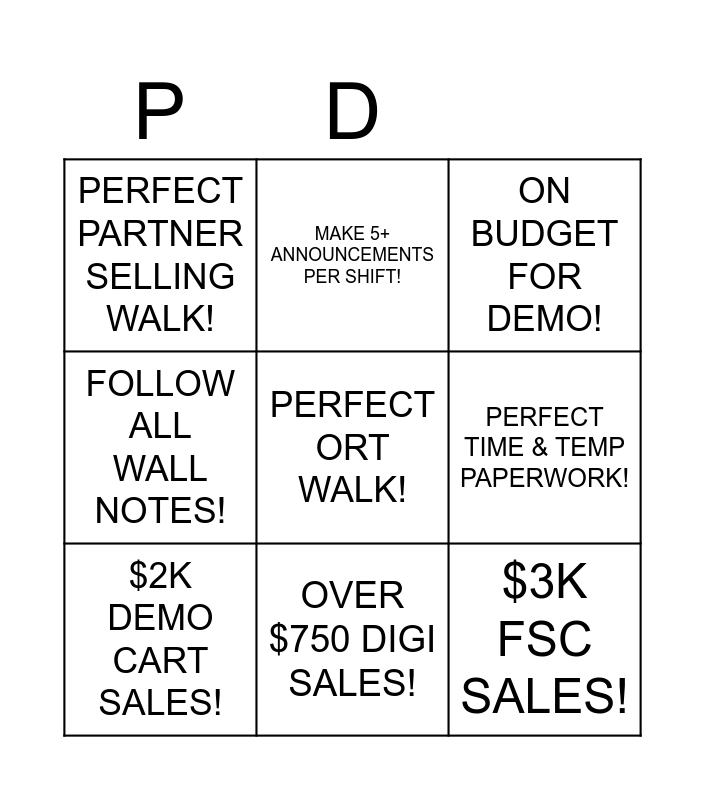 This bingo card has 11 words: $3K FSC SALES!, OVER $750 DIGI SALES!, PERFECT ORT WALK!, $2K DEMO CART SALES!, MAKE 5+ ANNOUNCEMENTS PER SHIFT!, ON BUDGET FOR DEMO!, PERFECT TIME & TEMP PAPERWORK!, TALLY SHEET COMPLETE!, FOLLOW ALL WALL NOTES!, PERFECT PARTNER SELLING WALK! and GIVE OUT 1 TOOU CARD!.